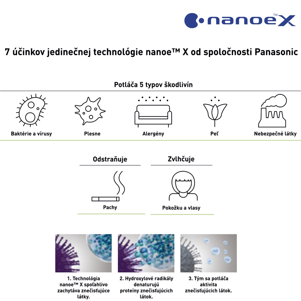 - Zahŕňa 7 účinkov jedinečnej technológie nanoe™ X : odstraňuje pachy, potláča 5 typov škodlivín (baktérie a vírusy, plesne, alergény, peľ a nebezpečné látky), zvlhčuje pokožku a vlasy